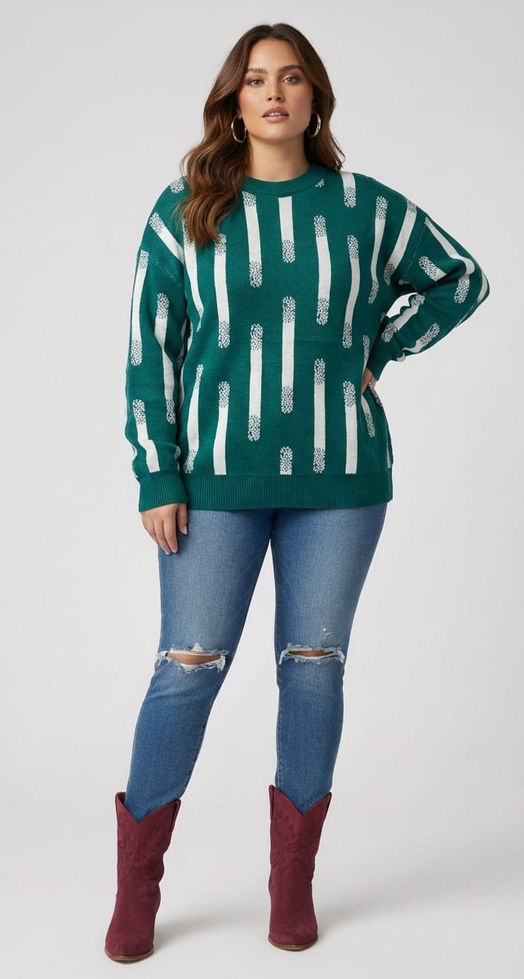 Geniş kesim dikey desenli kazak ile jean ve bot kombini yaparak kış stilinizi tamamlayın.